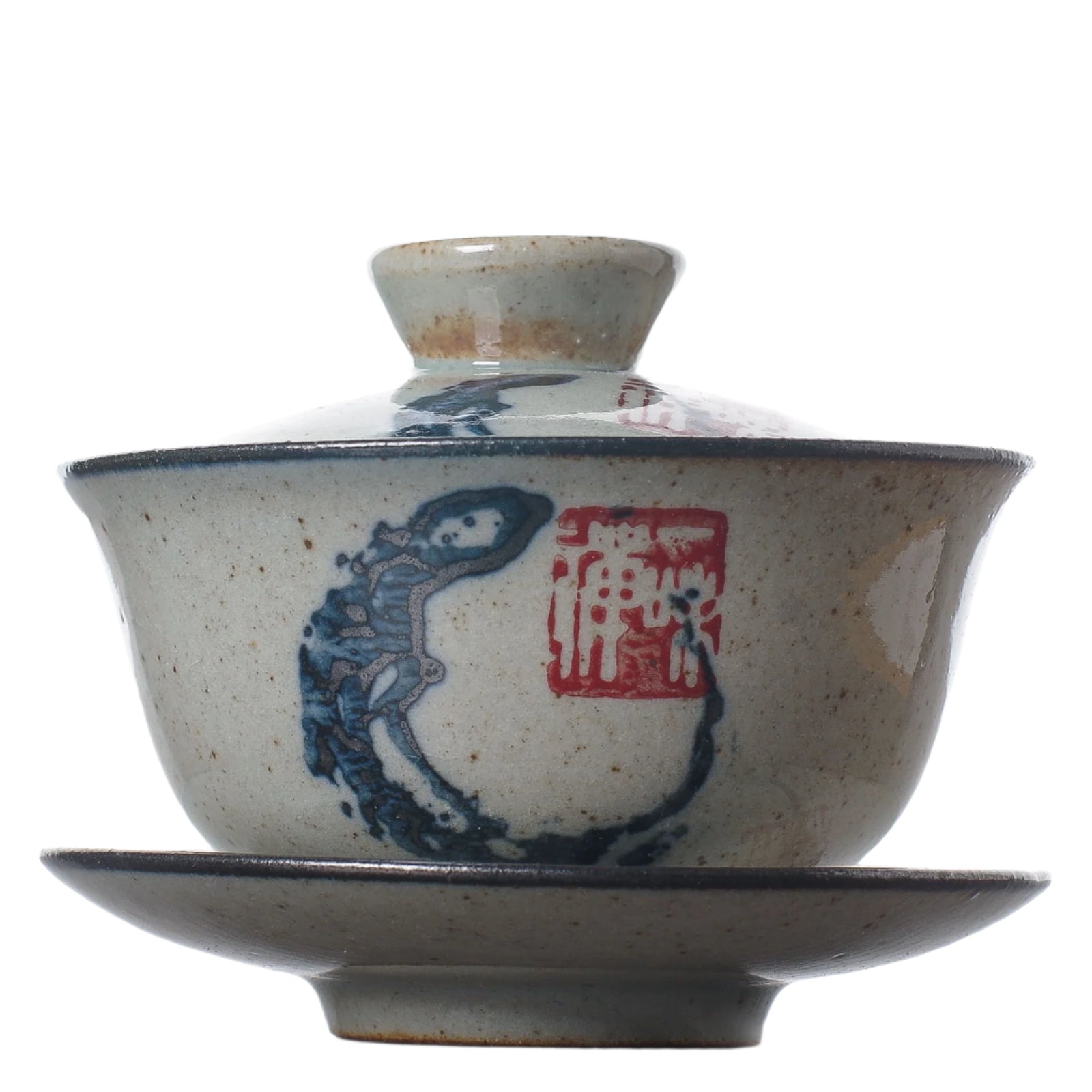 Ceramic gaiwan with underglaze traditional calligraphy painting.